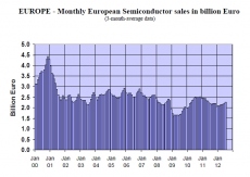 Les ventes européennes de semi-conducteurs sont restées stables en juillet 2012 par rapport au mois précédent (lorsqu’on les exprime en dollars) et ont progressé de 2,3% (si on les calcule en euros), selon les statistiques du WSTS relayées par le WSTS.