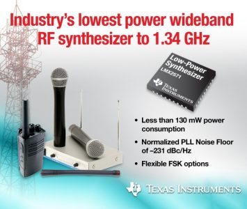 Couvrant la bande 10MHz à 1,34GHz, le LMX2571 de Texas Instruments se contente typiquement de 39mA, avec le VCO interne…