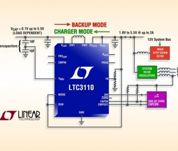 Fonctionnant en mode abaisseur-élévateur, le LTC3110 de Linear Technology effectue la charge rapide et l’équilibrage actif de deux supercondensateurs en…