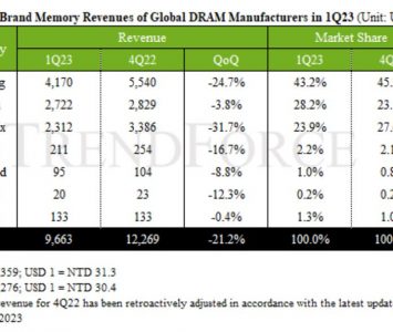 Selon le cabinet d’études TrendForce, le chiffre d’affaires de l’industrie des mémoires Dram a diminué de 21,2% au 1er trimestre…
