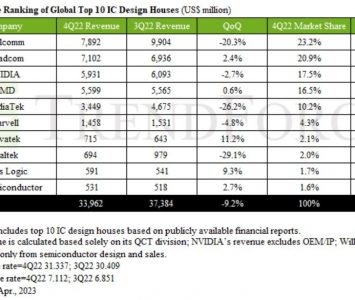 Selon le cabinet d’études TrendForce, les dix premières sociétés de conception de circuits intégrés ont vu leur chiffre d’affaires global…