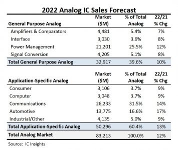 Après une hausse record de 30% en 2021, les ventes de circuits intégrés analogiques en 2022 devraient augmenter de 12%…